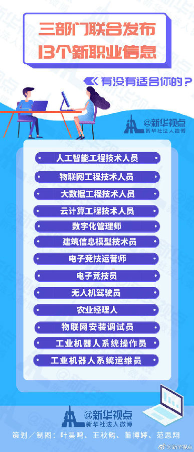 近日,人力资源社会保障部、国家市场监管总局、国家统计局正式向社会发布13个新职业信息。新职业包括人工智能工程技术人员、物联网工程技术人员、大数据工程技术人员、云计算工程技术人员、数字化管理师、建筑信息模型技术员、电子竞技运营师、电子竞技员、无人机驾驶员、农业经理人、物联网安装调试员、工业机器人系统操作员、工业机器人系统运维员等,是自2015年版国家职业分类大典颁布以来发布的首批新职业。
