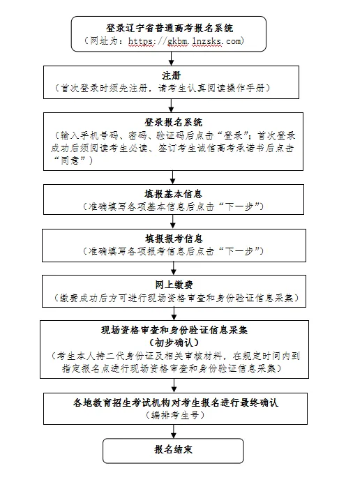 所有已按规定完成网上报名并缴费的考生须在规定时间到指定报名点进行现场资格审查、身份验证信息采集、提交《2021年辽宁省普通高等学校招生考生思想品德考核表》(除省内普通高中应届考生外的全部考生),交验有效身份证件,采集照片(面颊特征)及指纹特征信息,核验本人报名信息。