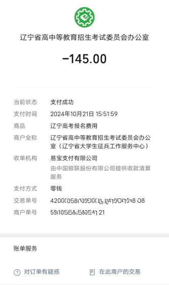 具体交费与否可以查询自己的支付记录,辽宁省一般的家长是2024年10月21日交费的。如样例: