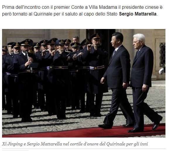 总统亲迎,检视仪仗队,奏响两国国歌,总统府的上空飘扬起中国国旗,举行盛大的国宴……意大利《共和国报》指出称,这一切,都是一个重要国家元首来访时才会出现的。