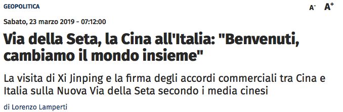 意大利新闻网站Affaritaliani发表文章《中国来到意大利:“欢迎,让我们一起改变世界”》:习近平的到访以及“一带一路”协议签署的相关新闻,几乎占据了所有媒体的头版。“一带一路”协议的签署不仅意味着意中两国在商业方面将有更多的往来并获益,同时还意味着“中国在政治和外交上都取得了巨大的成功”。图片来源:新闻网站Affaritaliani报道截图