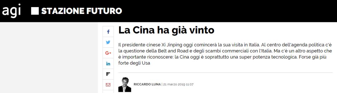 意大利AGI通讯社文章《中国已经赢了》:人们已经意识到,“一带一路”是一条连接着中国与欧洲的新贸易线路。此外,我们应当要注意,今天的中国已经是一个技术超级大国了,它甚至有可能已经比美国都强大了。图片来源:AGI通讯社报道截图